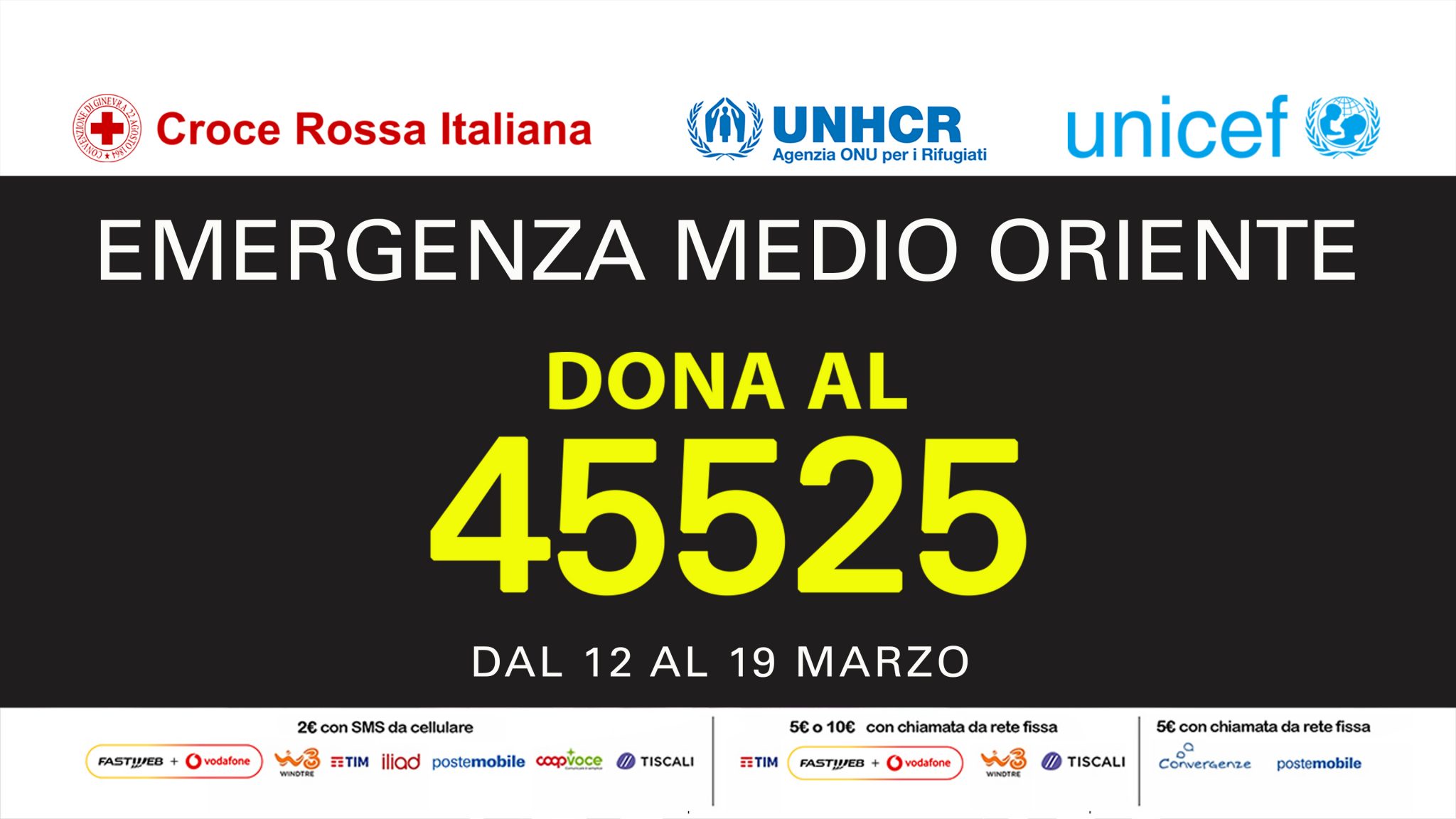 12 marzo 2025 – Con il supporto di RAI per la Sostenibilità – ESG, RAI sosterrà informativamente – dal 12 al 19 marzo la campagna di raccolta fondi straordinaria con numero solidale 45525 lanciata congiuntamente da Croce Rossa Italiana, UNICEF e UNHCR per rispondere alla grave emergenza umanitaria in corso in Medio Oriente. La situazione è drammatica, centinaia di migliaia di persone sono fuggite dalle proprie case e il numero delle vittime – soprattutto tra i civili – cresce ogni giorno.