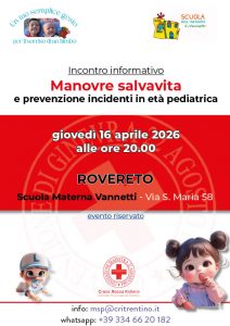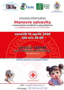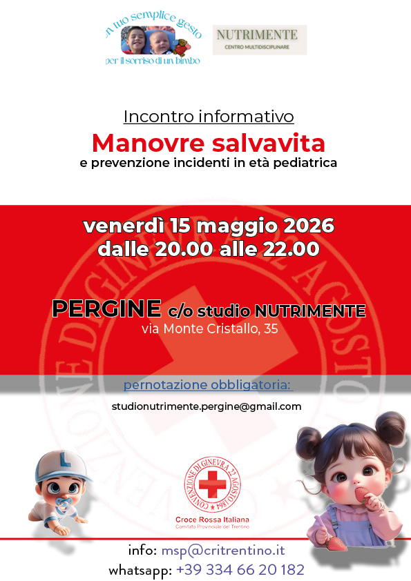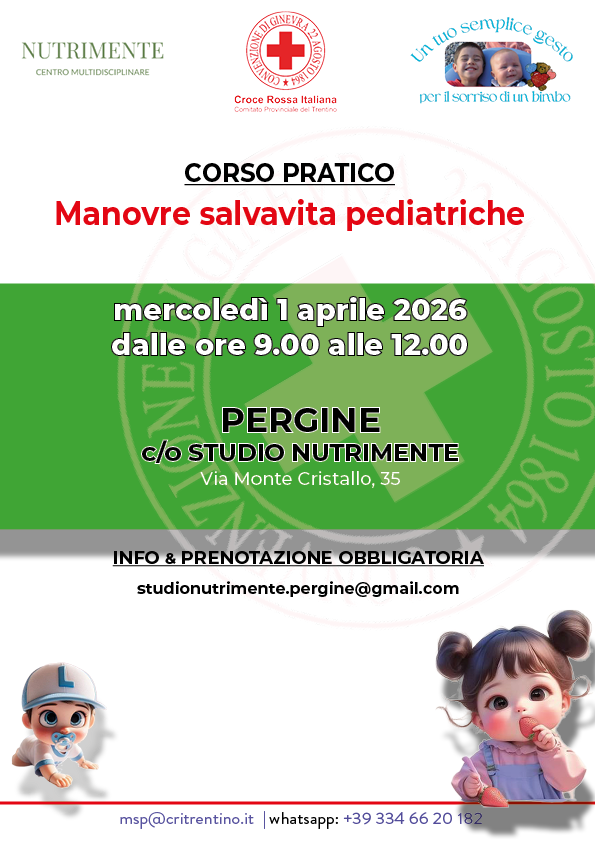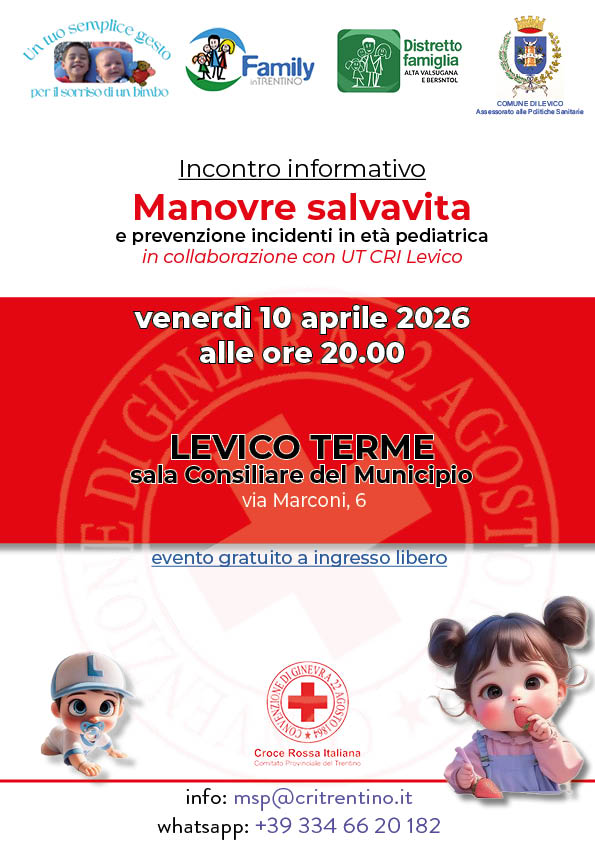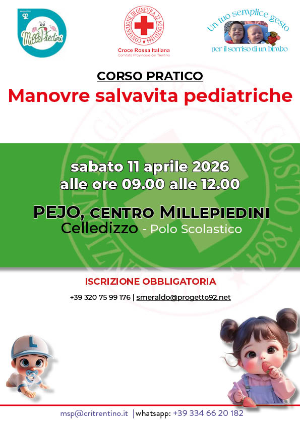 Per questo la Croce Rossa del Trentino dal 2010 si occupa della divulgazione delle manovre salvavita pediatriche rispetto all’ostruzione delle vie aeree da corpo estraneo. La formazione avviene attraverso: