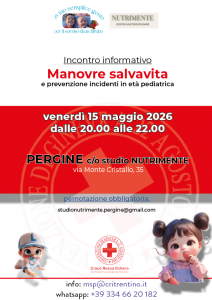 della durata di 2 ore circa, a titolo gratuito ed aperti a tutti con lo scopo di diffondere i principi di educazione sanitaria specifica. All’interno dei nostri incontri si affronteranno argomenti fondamentali quali: la prevenzione degli incidenti in età pediatrica, sonno sicuro, manovre disostruzione pediatrica, manovre salvavita pediatriche e chiamata di soccorso.